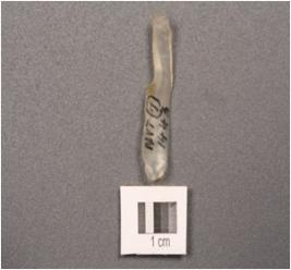 | Description / विवरण | Chalcedony parallel sided blade with a mid ridge, broken distal end. |