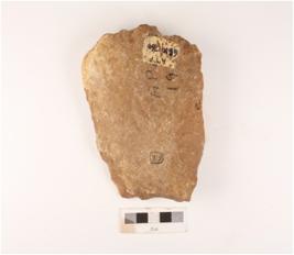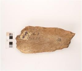 | Description / विवरण | A cleaver posterior end partly broken, broad working edges, positive bulb visible near striking platform. |