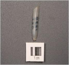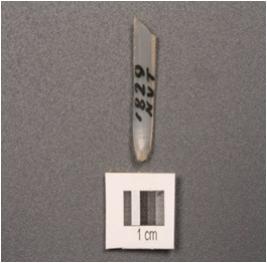 | Description / विवरण | Chalcedony parallel sided blade with double ridge, used wear mark on cutting edges, trapezoidal section, broken distal end. |