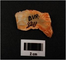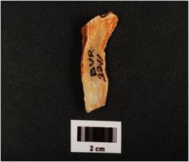 | Description / विवरण | A blade made on chalcedony with prepared platform, diffused bulb on ventral side, mid ridge on dorsal side, natural band visible on surface, use wear marks along cutting edges, |