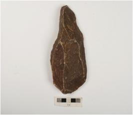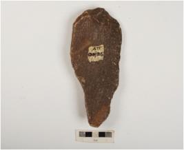 | Description / विवरण | A unifacial handaxe on end struck flake made block-on-block technique with alternate flake scars on surface, prepared platform and irregular retouched on cutting edge, prominent bulb on ventral surface. |