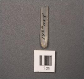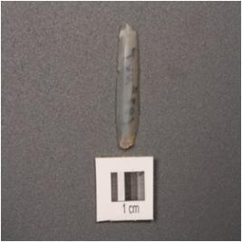 | Description / विवरण | Chalcedony parallel sided blade with ridge, diffused bulb, used wear marks on cutting edges, trapezoidal section. |