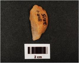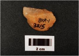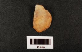 | Description / विवरण | A flake made on quartz, cortex visible on dorsal side, use wear marks along cutting edges, |