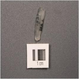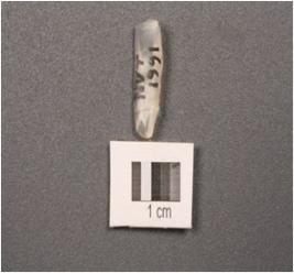 | Description / विवरण | Chalcedony parallel sided blade with a double ridge, trapezoidal section, used wear mark on cutting edges, diffused bulb on ventral side. |