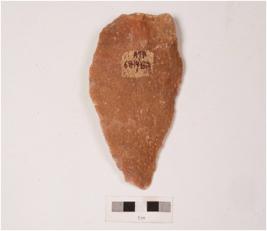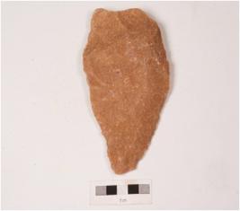 | Description / विवरण | Handaxe made on a quartzite with prominent bulb on ventral irregularly retouched edge and made by employing soft hammer techique. |