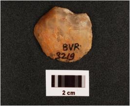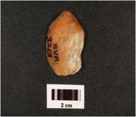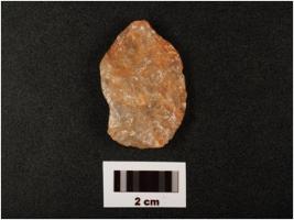 | Description / विवरण | A utilized flake made on quartz, unprepared platform, diffused bulb on ventral side, use wear marks along cutting edges, cortex visible on dorsal side, |