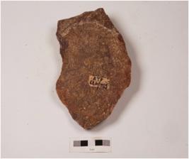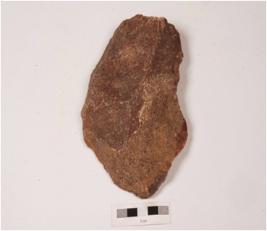 | Description / विवरण | A cleaver made on quartzite end struck flake, prepared platform, flake scars on dorsal side, prominent bulb on ventral and irregularly retouched edges. |