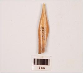 | Description / विवरण | Fragment of a bone point with plano-convex in section, polished both sides, slightly broken at one end, pointed broken other end and smooth surface. |