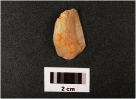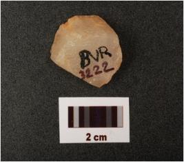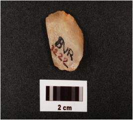 | Description / विवरण | A flake made on quartz, flake scars on surface, use wear marks along cutting edges, |