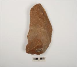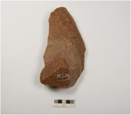 | Description / विवरण | Handaxe made on a quartzite pebble with flake scars on both sides, irregularly retouched edges and made by employing block on block techinque. |