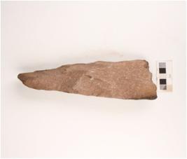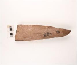 | Description / विवरण | A cleaver, with broad cutting edge, cortex visible on posterior end and flake scars visible on both surface. |