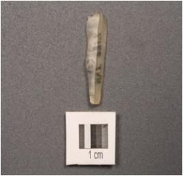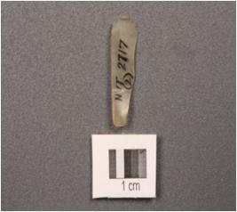 | Description / विवरण | Chalcedony parallel sided blade with a single ridge, triangular section, prominent bulb. |