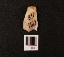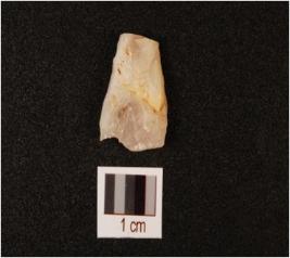 | Description / विवरण | A flake made on quartz, plain ventral and dorsal, use wear marks on edges and diffused bulb on ventral. |