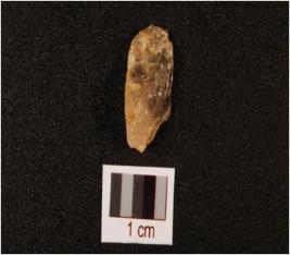 | Description / विवरण | A small flake made on quartz, prepared platform, flake scars are visible and use wear on edges. |