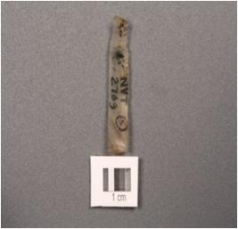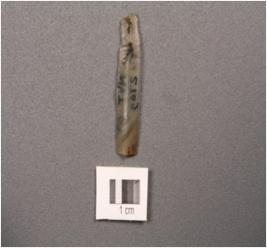 | Description / विवरण | Chalcedony parallel sided blade with a mid ridge, heat treatment given raw material, used wear mark on curring edge, triangular section. |