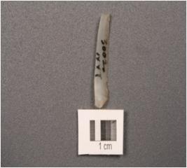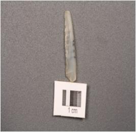 | Description / विवरण | Chalcedony parallel sided blade with a single mid ridge, prominent bulb on ventral side, use wear mark on one side cutting edge, broken distal end. |