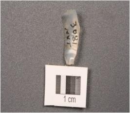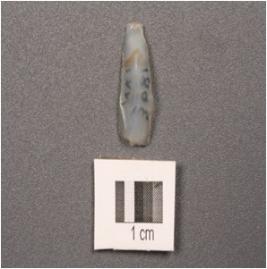 | Description / विवरण | Chalcedony parallel sided blade with mid ridge on dorsal surface, prominent bulb, use wear marks on cutting edges. |