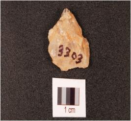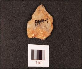 | Description / विवरण | A quartz end struck flake, prepared platform and diffused bulb on ventral side. |