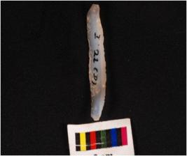| Description / विवरण | Parallel sided microlith blade with prominent mid ridge on dorsal and use wear marks on cutting edges. Triangular in section and partly chipped off on dorsal. |