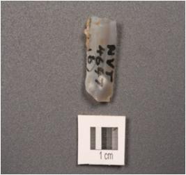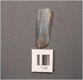 | Description / विवरण | Chalcedony parallel sided blade with ridge, prominent bulb on ventral side, use wear mark on cutting edge. |