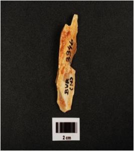 | Description / विवरण | A flake made on chert with prepared platform, diffused bulb on ventral side, cortex visible on one side, use wear marks along cutting edges, |