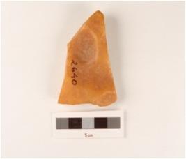 | Description / विवरण | A quartz flake with prepared platform and flake scars on surface. |
