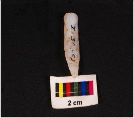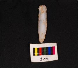 | Description / विवरण | Chalcedony microlith blade with prominent mid ridge on dorsal. Use wear marks on cutting edges and triangular in section. |