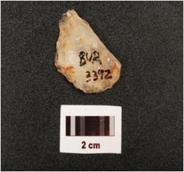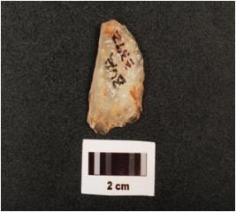 | Description / विवरण | A quartz end struck flake with two blade scars, striking platform, diffused bulb on ventral and right edge, |