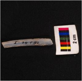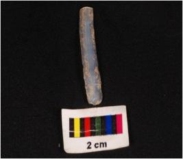 | Description / विवरण | Parallel sided microlithic blade with two ridges on dorsal side, trapezoidal in section, use wear marks along the cutting edges and diffused bulb on ventral side. |