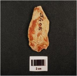 | Description / विवरण | Chert side scraper on end struck flake with three blade scars on dorsal side, prepared platform, diffused bulb on ventral side and irregular retouches on working edge, |