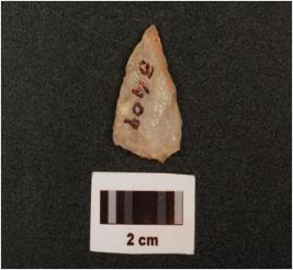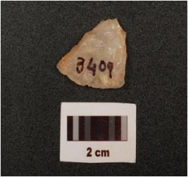 | Description / विवरण | A quartz flake, triangular in shape, smooth surface and use wear marks on edges, |