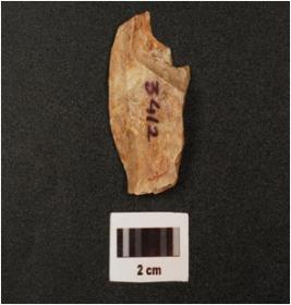| Description / विवरण | A chert flake with prepared platform, bulb on ventral side, broken along at distal end and use wear marks on cutting edge, |
