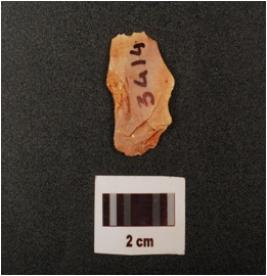 | Description / विवरण | A chert flake with smooth surface, striking platform, diffused bulb on ventral side, partly chipped off and slightly cortex is visible. |