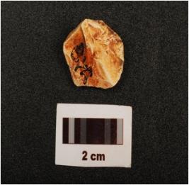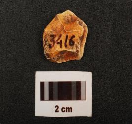 | Description / विवरण | A chert flake with three blade scars on dorsal side, striking platform, diffused bulb on ventral side and use wear marks on one side, |