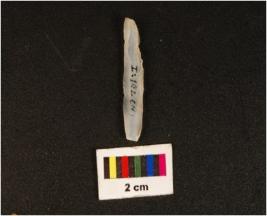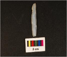 | Description / विवरण | Pen knife shaped chalcedony blade, mid-ridge on dorsal, flat ventral, irregular edges, distal ends. |