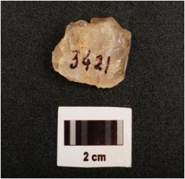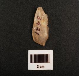 | Description / विवरण | Flake, made on quartz with smooth surface, partly broken and use wear marks on working edge, |