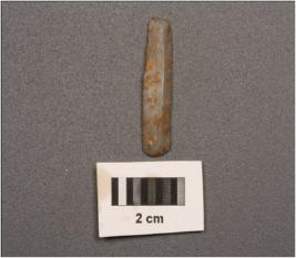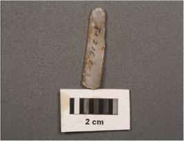 | Description / विवरण | Parallel sided microlithic blade with double ridges on dorsal and trapezoid in section. Diffused bulb on proximal end and use wear marks on cutting edges. |