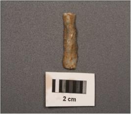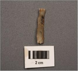 | Description / विवरण | Chalcedony blade, prominent mid ridge on dorsal side, triangular in section, broken at proximal end, distal end is pointed, use wear mark along the cutting edges. |