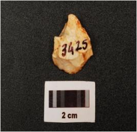 | Description / विवरण | Side scraper on end struck flake made on chert with striking platform and irregular retouches on working edge, |