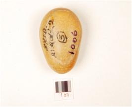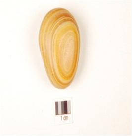 | Description / विवरण | A pebble tool made of banded agate with polished surface, oval in section and orange in colour. |