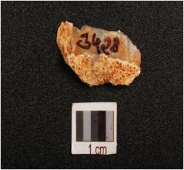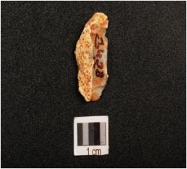 | Description / विवरण | Fragment of a blade made on chert stone, flake scars on dorsal side, prominent bulb on ventral side, smooth surface, |