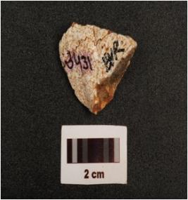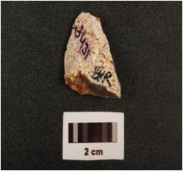 | Description / विवरण | A flake made with chert stone, flake scars on surface, use wear marks on working edge, smooth surface, |
