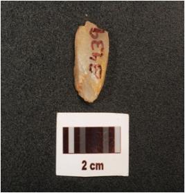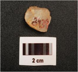 | Description / विवरण | Fragment of a blunted blade, flake scars on surface, broken along proximal end intact distal end, use wear marks along the working edge, |