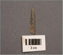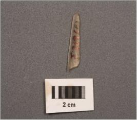 | Description / विवरण | Parallel sided blade with two ridges on dorsal side, use-wear marks on cutting edges, diffused bulb on ventral side, trapezoidal in section. |