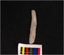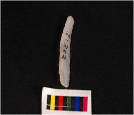 | Description / विवरण | Parallel sided microlithic blade with a mid ridge on dorsal side, tirangular in section and use-wear marks along the cutting edges. |