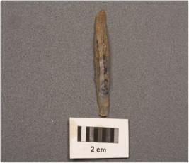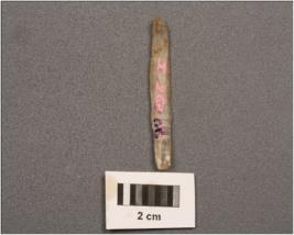 | Description / विवरण | Parallel sided microlithic blade with two ridges on dorsal side, diffused bulb on ventral side, use wear marks on cutting edges, trapezoidal in section and slightly pointed at distal end. |