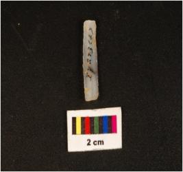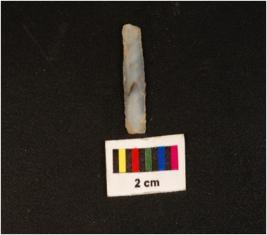 | Description / विवरण | Parallel sided chalcedony blade, mid-ridge on dorsal, flat ventral, proximal end, irregular edges. |