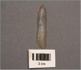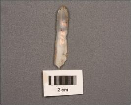 | Description / विवरण | Parallel sided chalcedony blade, wavy ridge on dorsal, use wear on edge, prominent bulb on proximal end. |