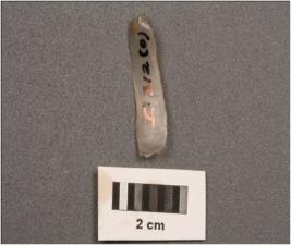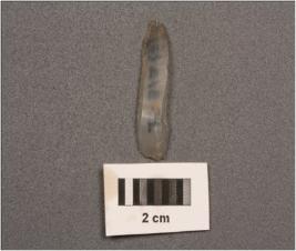 | Description / विवरण | Parallel sided chalcedony blade, wavy ridge on dorsal side, use wear on edge, prominent bulb on proximal end. |