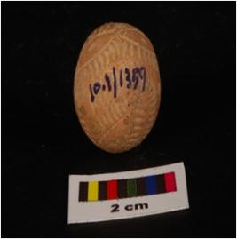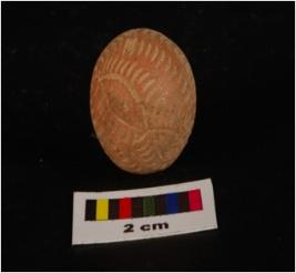 | Description / विवरण | Terracotta circular in shape sling ball. Foliage incised design on surface with smooth surface and red in colour. |